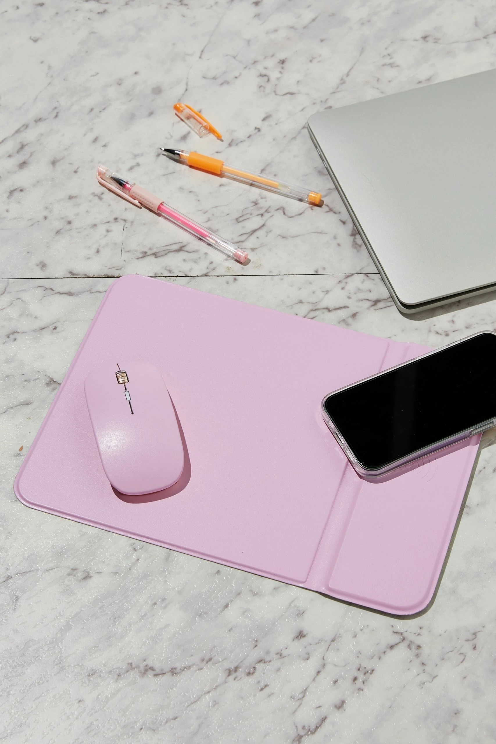 Elevate your work space with our wireless charging mouse pad. Simply place your wireless charging device on the charging pad and it will automatically begin to charge. No wires, no worries.